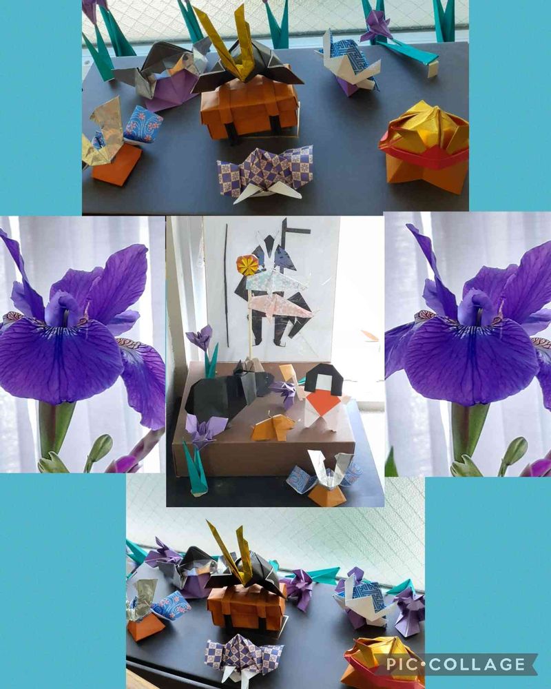 職場の階段の出窓に飾ってある入居者さんが折られた折り紙の鯉のぼり、金太郎と熊、兜色々🎵