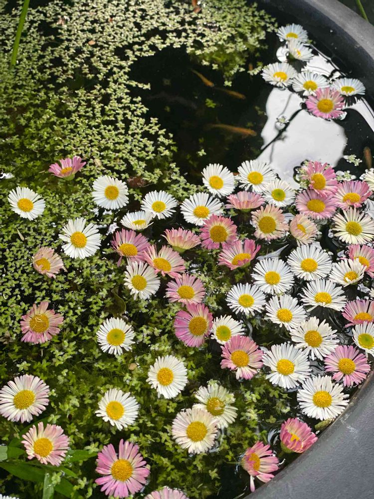 ひなみさん、おはようございます。あ、メダカがたくさん泳いでる!蚊除けになりますか?お花もたくさんで、めだかさんの日傘みたいですね💠💠💠