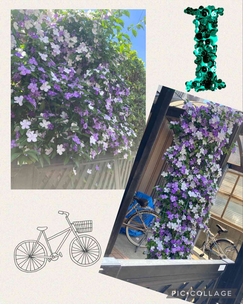 大きなニオイバンマツリ💜🤍💚が塀の上に咲いていました 玄関柱もニオイバンマツリ💜🤍💚 ワクワクして🤳