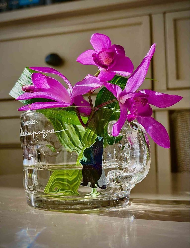 紫蘭、ガラスの入れ物にさりげなく