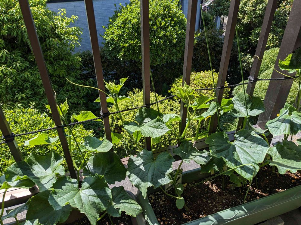 朝日を浴びるキュウリの苗はイキイキと…実が4つ付いている〜〜〜👏😄🎶⤴️⤴️