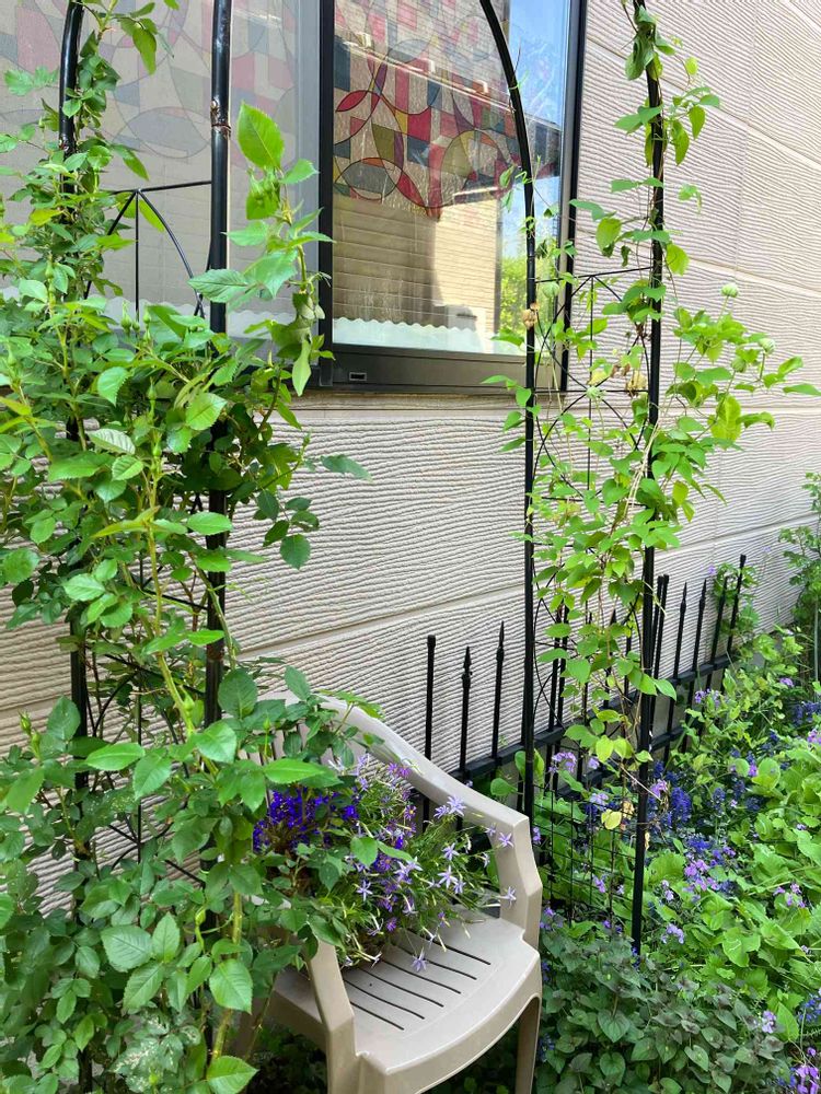薔薇とクレマチスのアーチの間のサルビアアズキセンセーションが⭐️になられたので椅子と先日作った寄せ植えを置いてみたw
