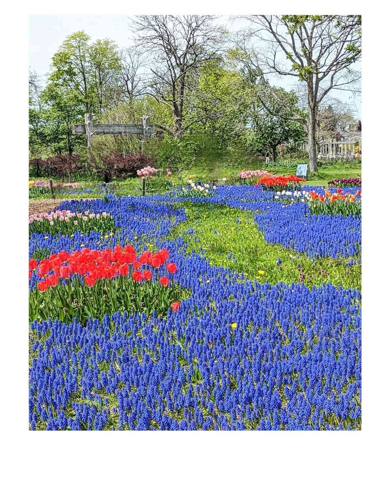 札幌・百合が原公園の春を彩ってくれる名風景と言えば【ムスカリの道】 色とりどりのチューリップが華やかに盛り上げています。