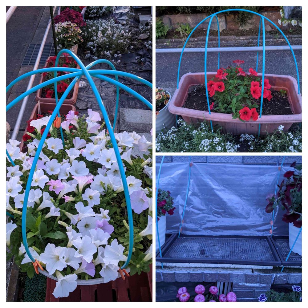 右上は横長プランター。共に動かせないので、トンネル支柱を刺してビニールかけてパッカーで留めるだけ。完成です😁😁