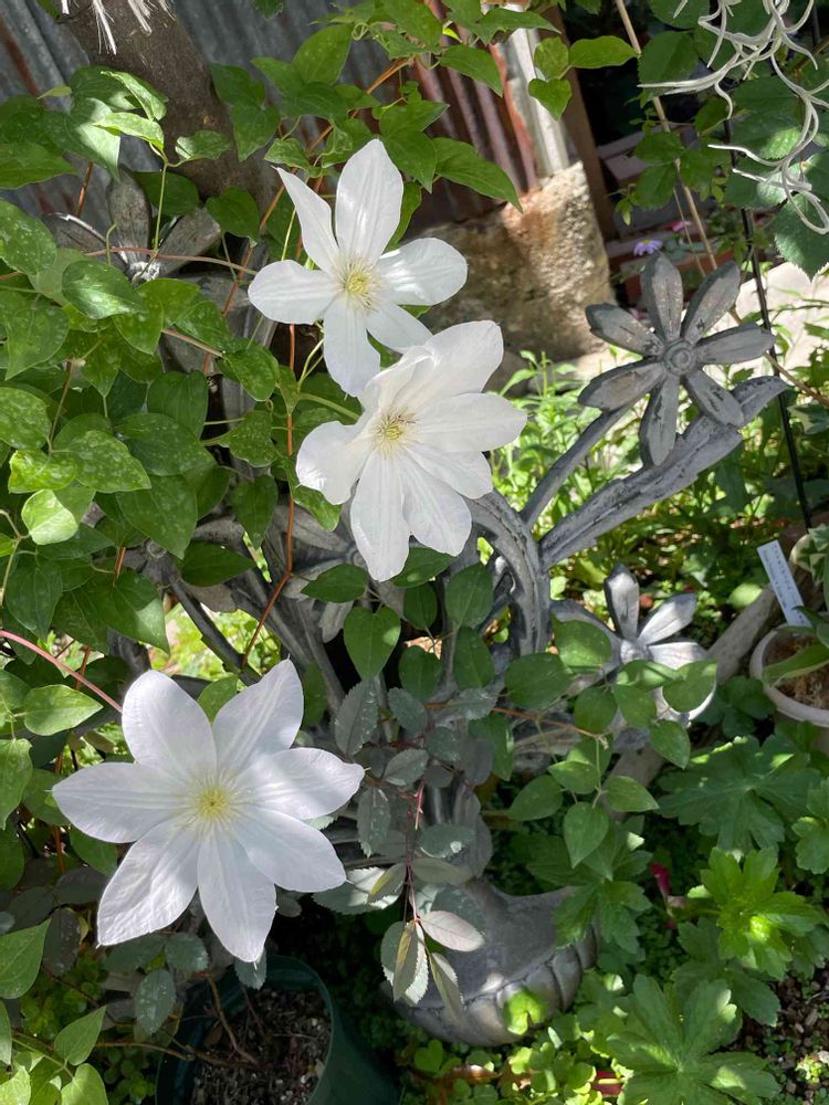 こちらは名前の知らない挿木した妹のクレマチス🌸隣のアイアンのお花とよく似てるでしょ🤗