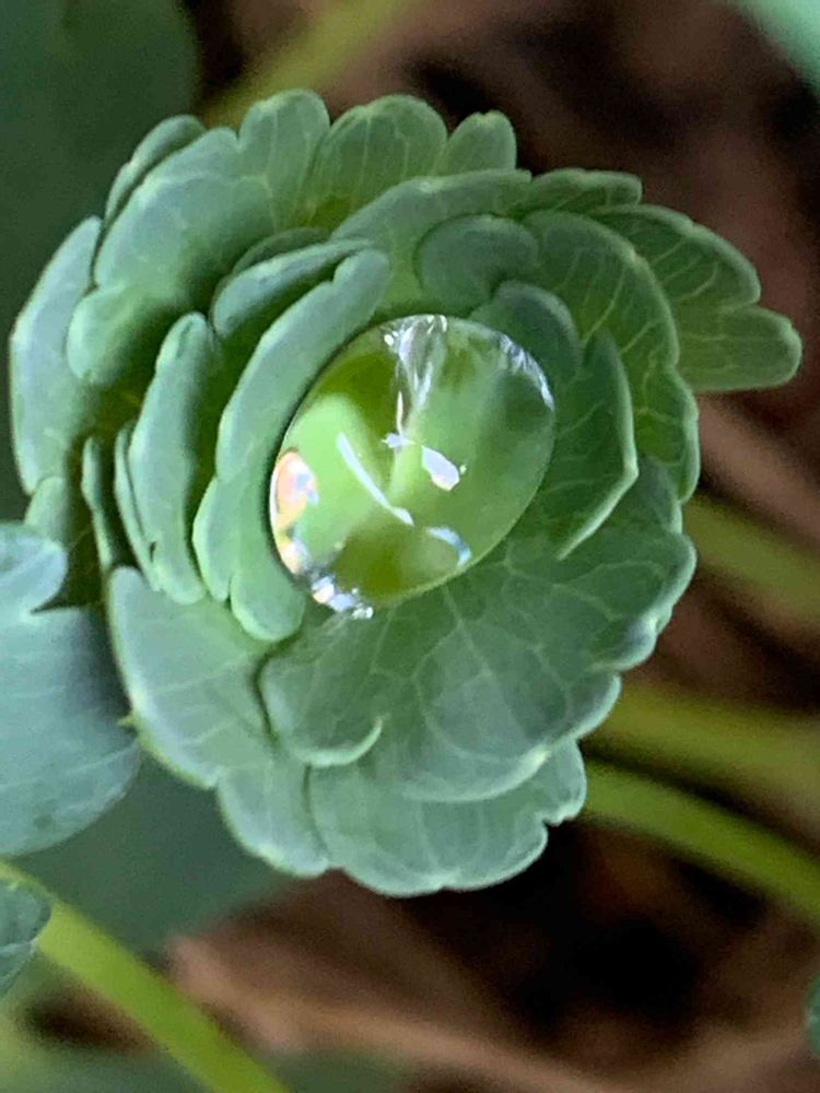 今朝、オダマキの葉っぱに雫ちゃんが
