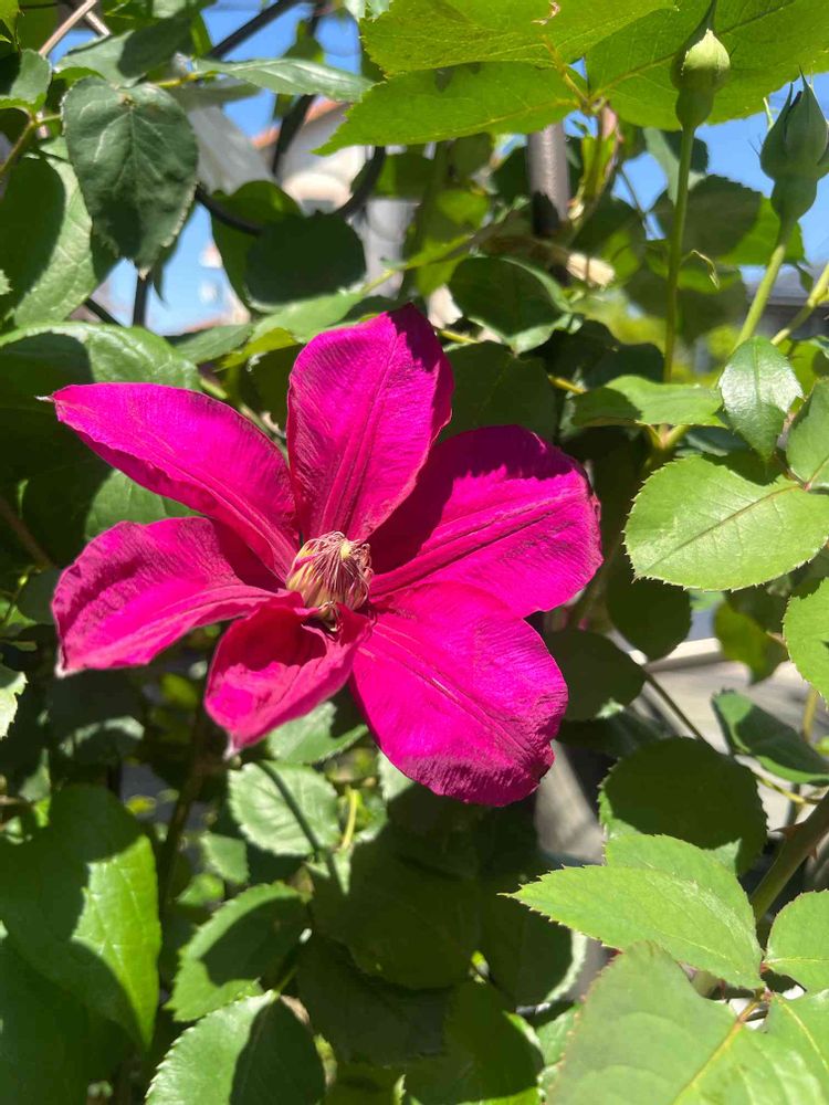 クレマチス レッドクーラー。何気にピンク寄り💦このアーチは色々考えてバラ、クレマチスをアーチに誘引したつもりなのにみ~んな赤系同系色💦なんで?なんで~