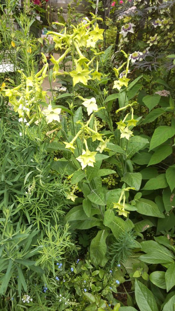 この星型の薄黄色の花はハナタバコです。かつては 専売公社でしか栽培できなかったタバコ属ですが 民営化された1985年から ハナタバコの栽培も認められるようになったのだとか…。