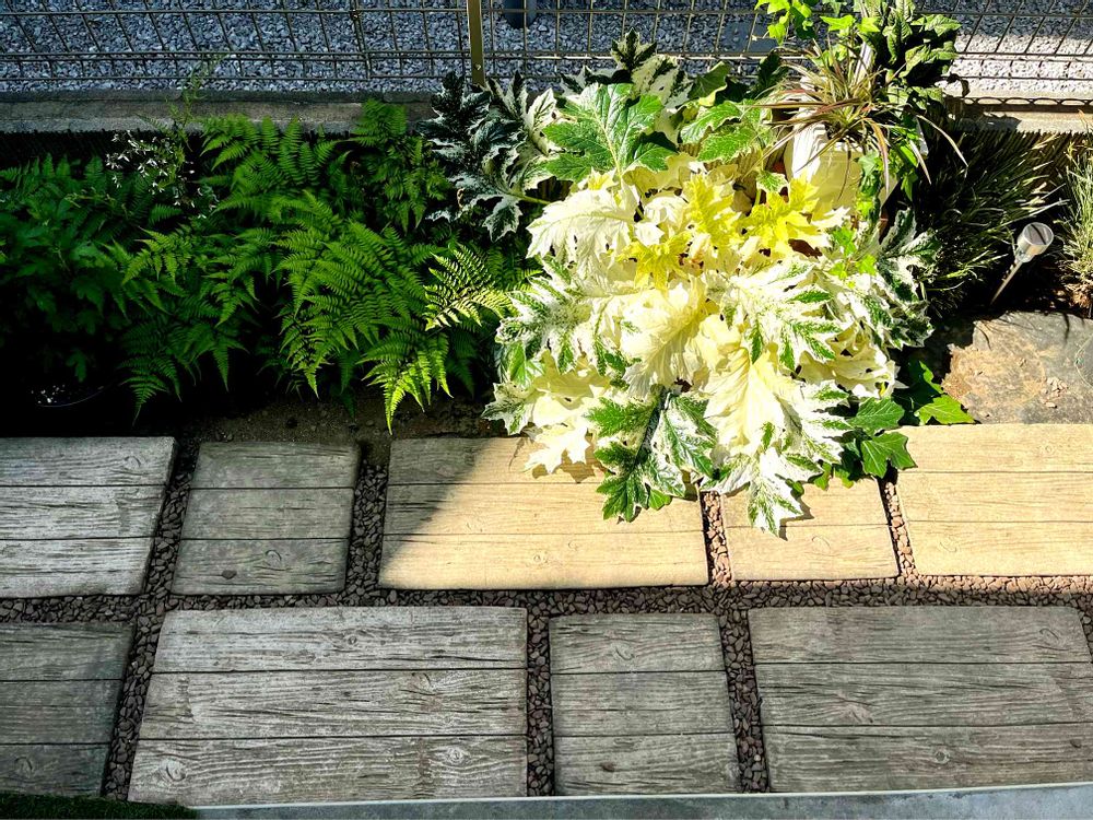 西向きのエントランスは憧れの乙庭を意識して、メインはメリアンサスマヨール。 小さなリビング前、夏は日差しをタープで日除けしながら、ホワイトカラーのシェードガーデンを楽しんでいます。