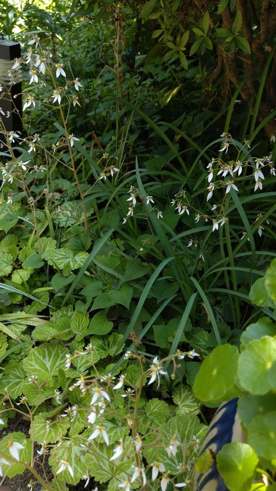 木の陰に、ユキノシタの白いお花がチラチラと…