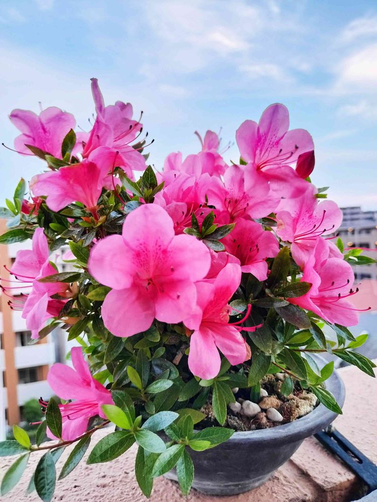 さつき盆栽が満開となりました。しかし姿形は不格好💦YouTubeによると、このあとは花がら摘み、枝の剪定らしいが…どうなることやら。
