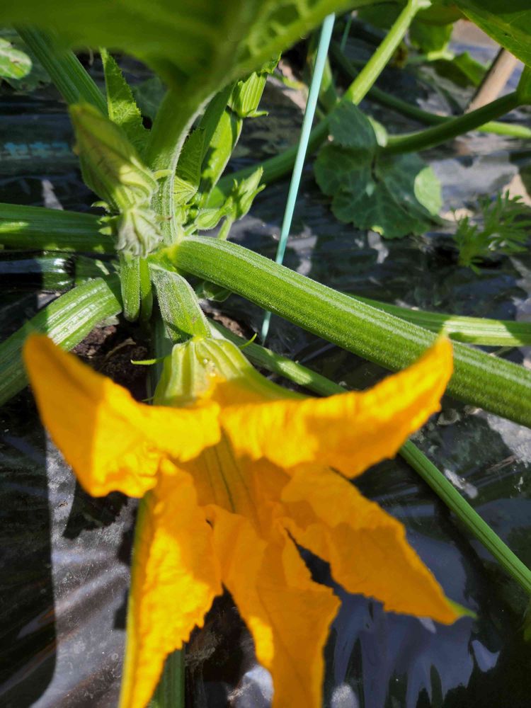 雌花ばかりで、雄花が無かったズッキーニ、やっと雄花咲き、初めて交配出来ました。