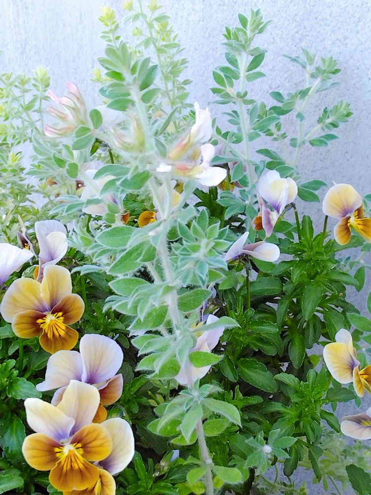 まだまだ元気な🍀ビオラ フロステッド・チョコレート🍀の寄植えです。 グリーンに🍀ロータスブリムストーン🍀をいれてますが、それと違う感じの葉が出てきて、白い花も咲いてきました❀❀🤗