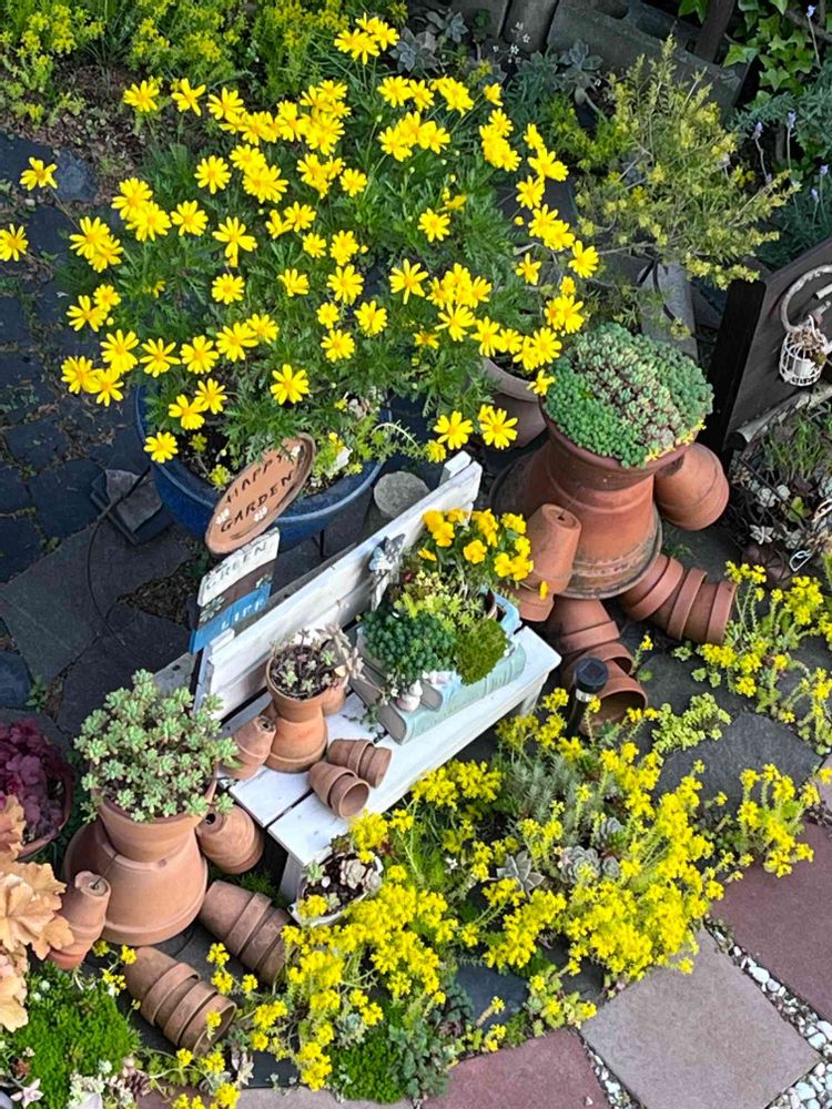 最後は満開を迎えたマーガレット🌼と真っ黄っ黄セダム💛を真上から🤳