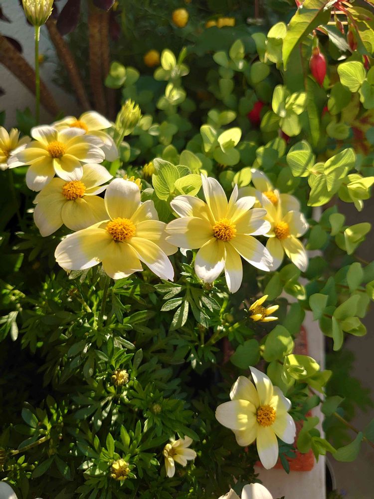二枚目投稿🌱ビデンスが朝日を浴びてキラキラですヾ(´︶`*)ノ💛✨奥は冬越しできた2年目のケントビューティー💚元気です😄🌱🌱