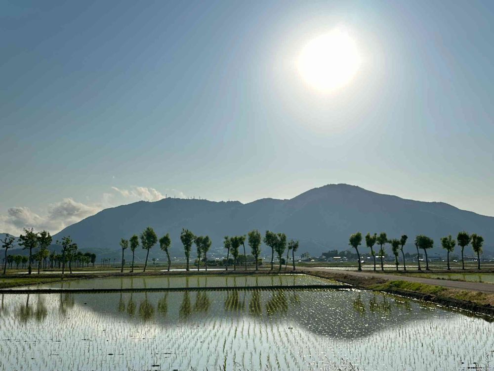 田植えが終わった田んぼに、弥彦山が美しかったです!