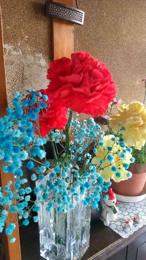 今日は、母の日のカーネーションの花束💐を買って来ました。黄色、赤いカーネーションとブルーのカスミソウの花が綺麗にたくさん咲いていました。