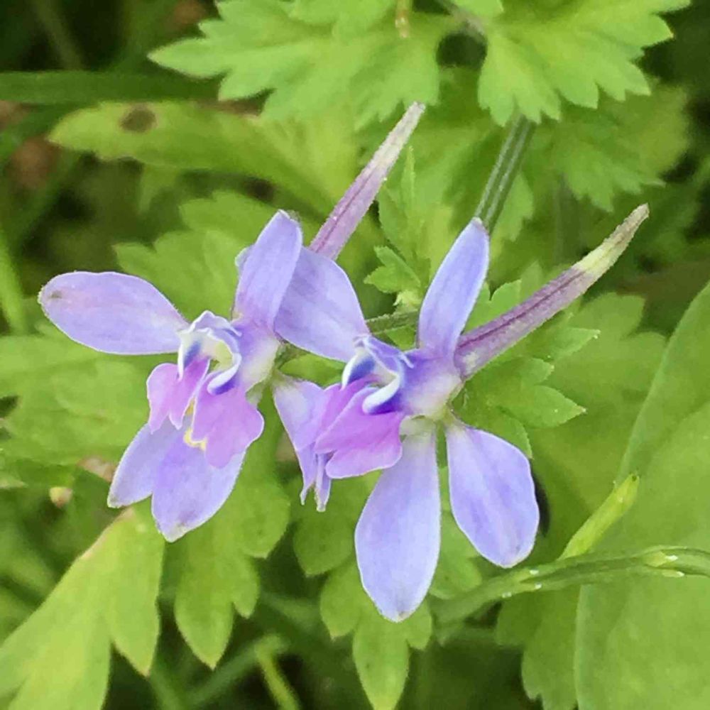 芹葉飛燕草。たかが雑草、されど雑草。林縁にかなり繁殖している。しゃがんでよく見ると、ツバメが飛んでいる姿を映しとったと言えなくもない。トンボにも見えるのが、愛嬌。この時分、トンボよりツバメを見かけることが圧倒的に多いので、納得。突起の距(きょ)があるだけで、「巨視的」な想像力が生まれる。