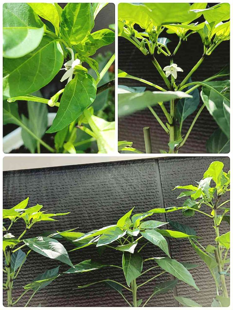 トウガラシの花が咲いた!背丈も支柱よりかなり高く茎も太くなった。