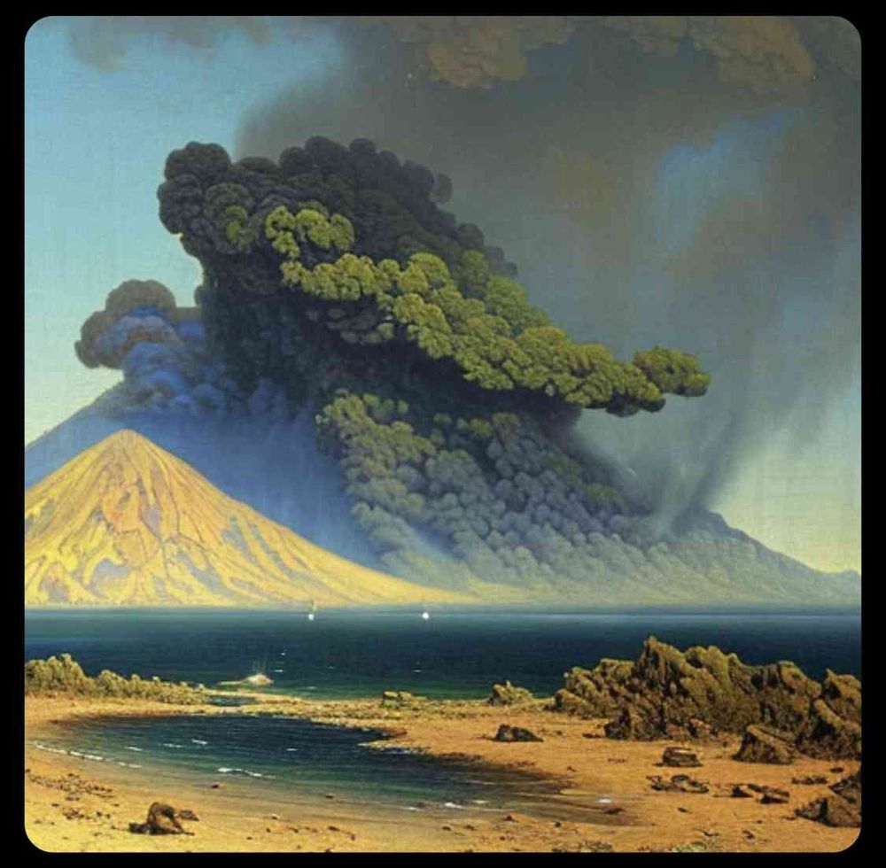10K,高品質,写実的,油絵, 風景画 , リアル, 絶景, 煙棚びく桜島, 青天,イワン・クラムスコイ