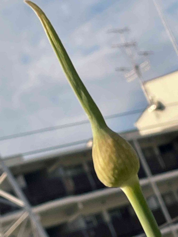 2023-5ー12(金)曇り☁️☁️ 今年はニンニク🧄の花を観てみよう 😋🥹😊たった1つ栽培中のジャンボニンニク 🌱ニンニクの芽が伸びてツボミの入った包みは未だ硬くて時間がかかるかなぁ〜🧐