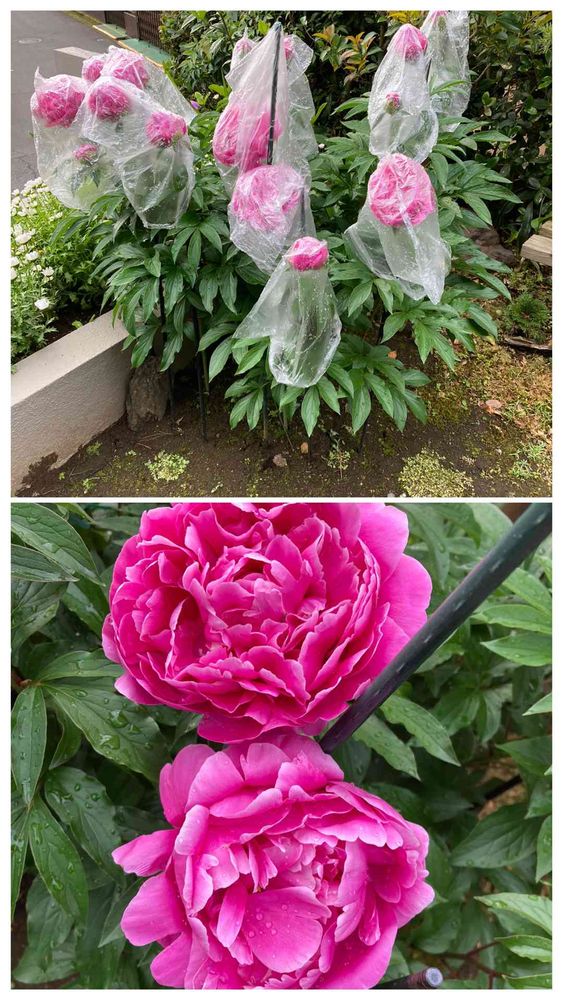 シャクヤク 昨日の雨対策にと、奥がビニール袋を被せました。