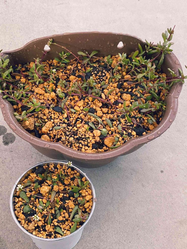 ①紅稚児・・・ハンキングとブリキ缶へ植え替え。お花はほぼカットしました。
