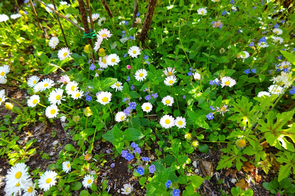 イングリッシュデージー、ティアレラ、クワガタソウが点在するところ