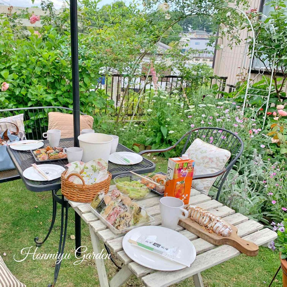 今日は友人達とガーデンランチ🍽️仲良しとバラと、美味しいデリ😋