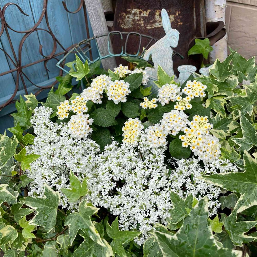 玄関前の鉢植え…ユーフォルビアとランタナ白がだんだん存在感を増してきた😍