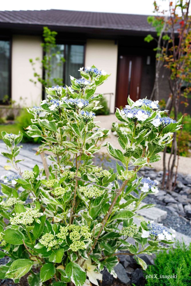 朝の散歩で大変綺麗にお庭を手入れされているお家があり,フイリガクアジサイが綺麗でした。園芸種と思いますが,こんなのもあるんですね。