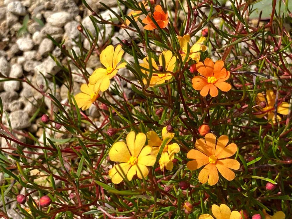 今日,植物園のロックガーデンで初めて出会った花。ヒルベルティア サニースマイルオレンジとサニースマイルレモン。オーストラリア原産。ディレニア(ビワモドキ)科ヒベルティア属の半耐寒性常緑低木。まだ小さい苗なので、低木には見えなかったな。花びらの形や色合いがとても可愛いかったよ。