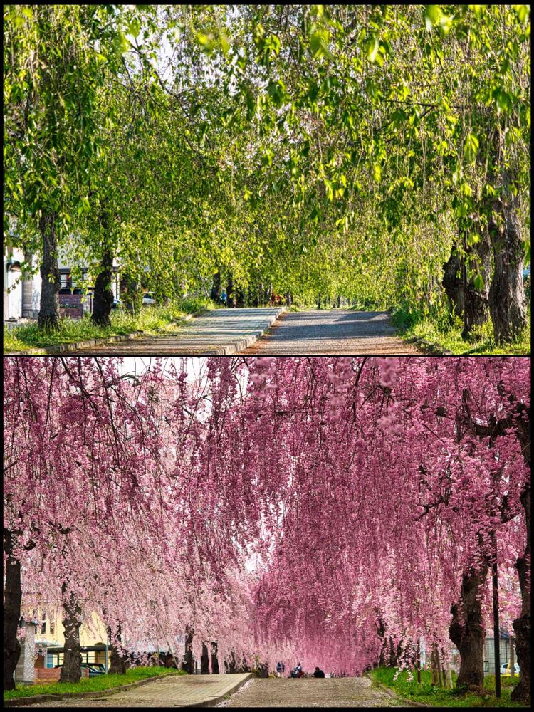 しだれ桜が春のピンクのカーテンからグリーンのカーテンに変化してきました