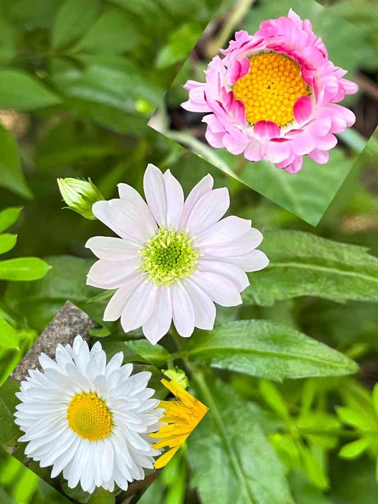 真ん中のお花をAIくんに聞いたら「ヒナギク」😓、ちょっと違うかな!