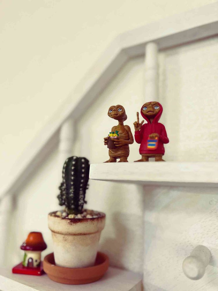 飾り棚にいるDAISOサボさん🌵名前はわからないけど形がまた可愛くて大好きなガチャET👽と📸✨