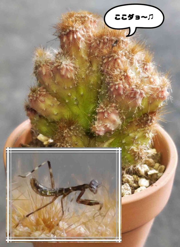 植替え前から完成まで、ず〜っと棘山をウロウロしてるカマキリ赤ちゃん🤣