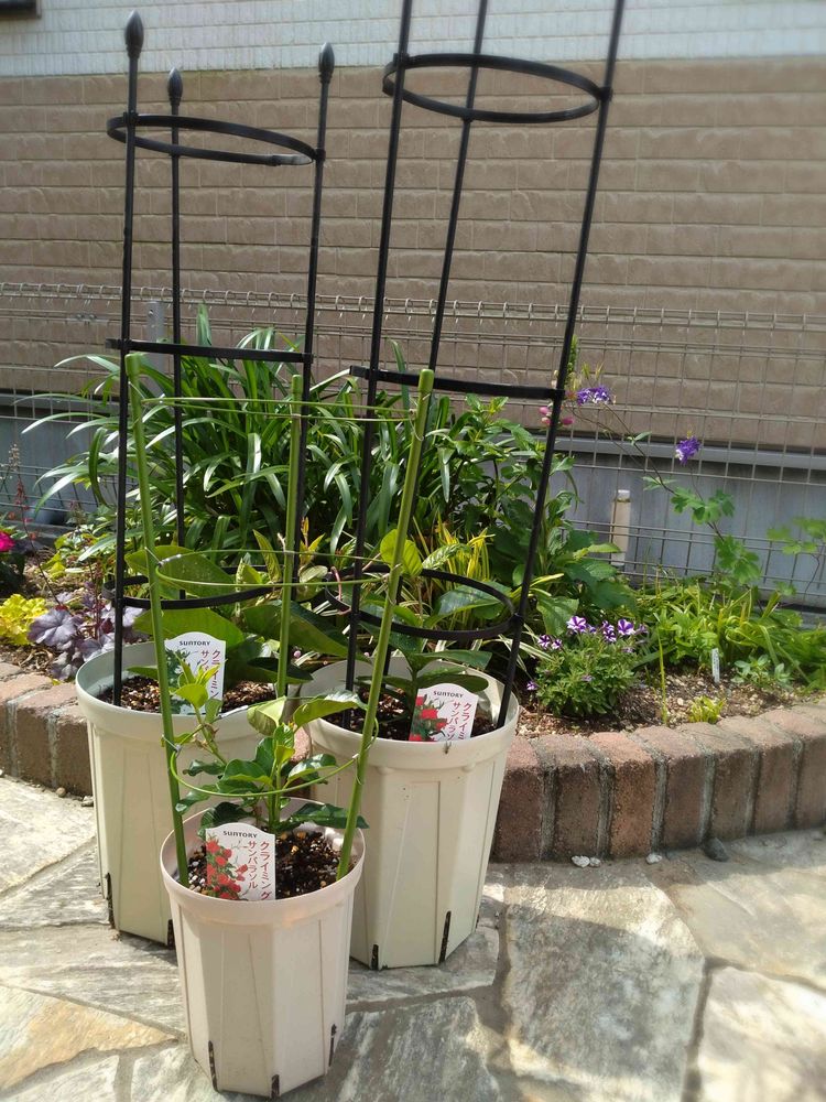 まずはレッドさん(8号鉢)のツルが一番に伸びてきたので、120cmの支柱を立てました🙆