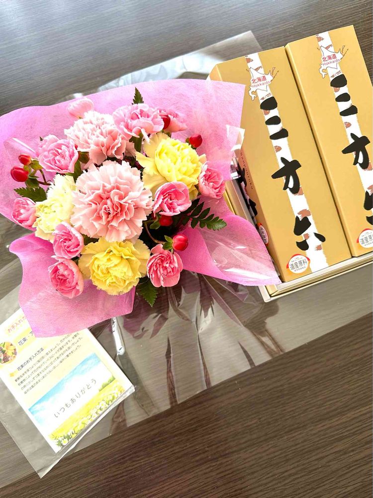 母の日花束💐 銘菓三方六付き 年輪を重ねてお世話になって来た感謝が現れた🎁ですネ🎶 素晴らしい息子夫婦🥰