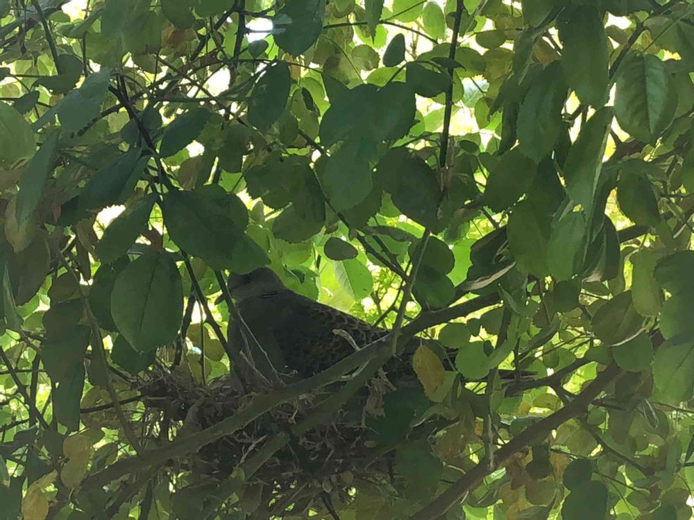 こんにちは🙂鳩さんが薔薇の枝の中に巣作りし、無事にひながかえりましたー。🐣