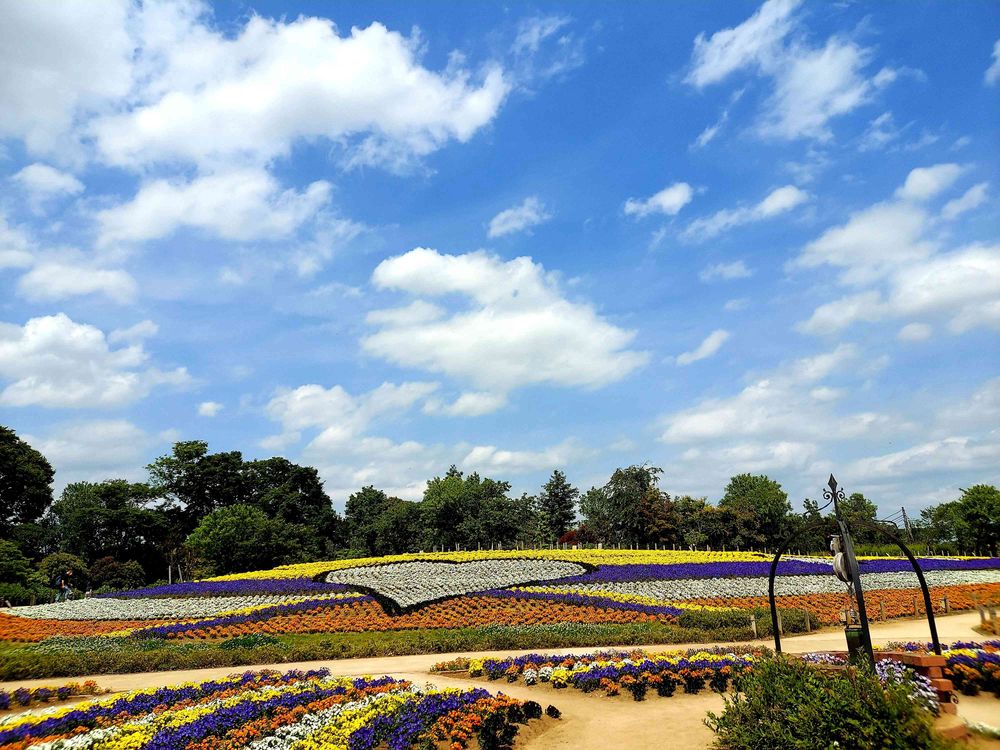 気持ちの良い青空に美しいお花畑の公園ですね😍