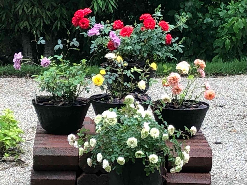 雨の土曜日、ピザ窯ポジションに我が家のミニ薔薇さん全員集合🎶