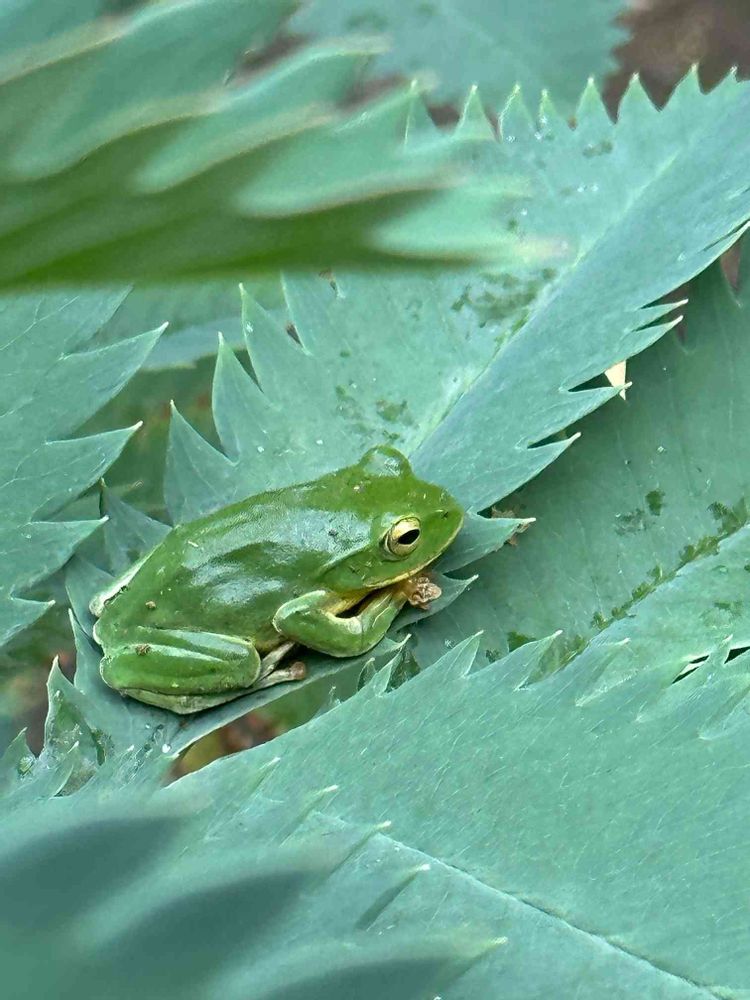 たった今撮った写真ですが、このカエルよく見てください!普通のアマガエルと違う!目の横の黒っぽい模様が全くない。レアなアマガエル発見か!?😆植物の話じゃなくてすみませんw