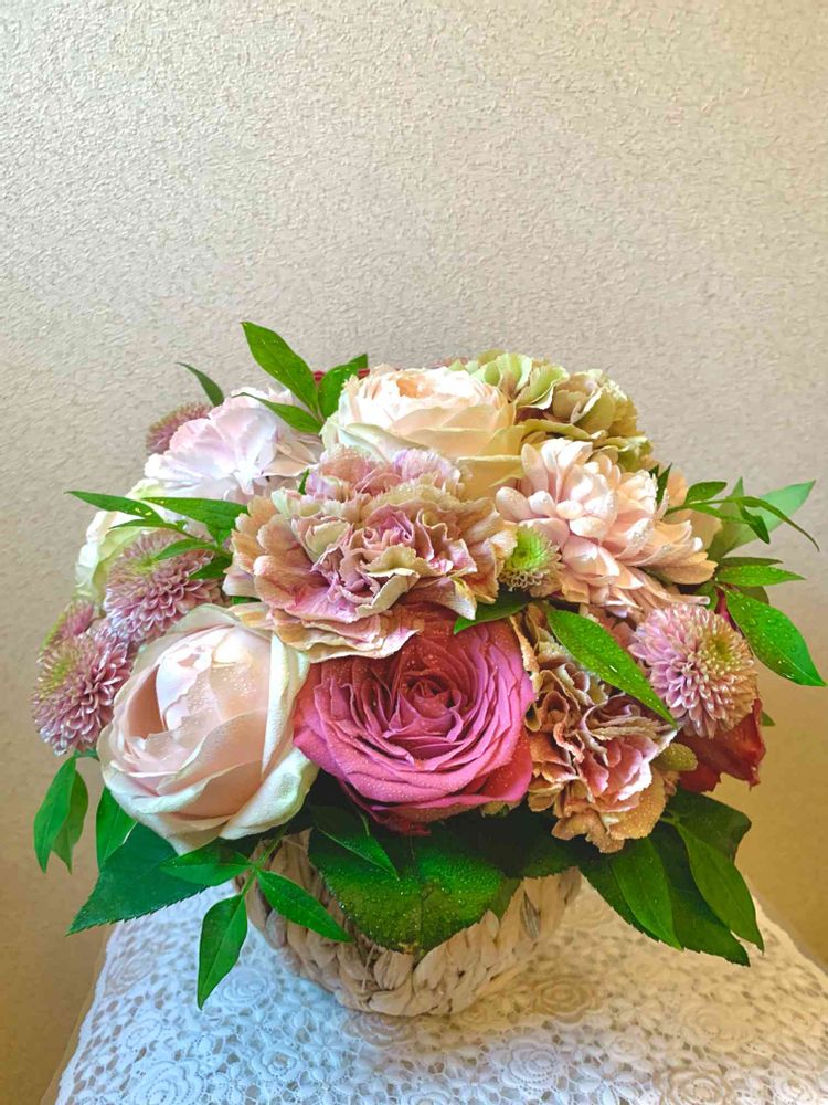 優しい色合いのバラとパウダーパステルのカーネーション、マムがこんもり、大人かわいい感じのアレンジメントです✨