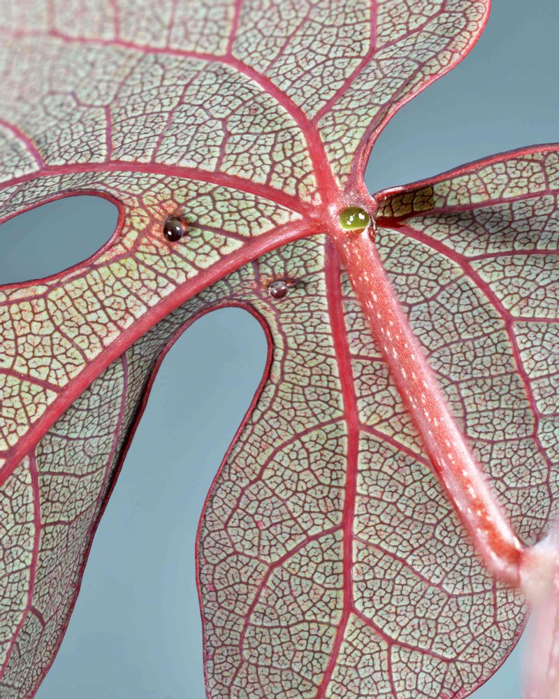 アデニア・ステイロサの葉の裏側の拡大。真珠腺と呼ばれる蜜状の球体を分泌しています。真珠腺は害虫の天敵を呼び寄せるための仕組みと考えられているようですが、まだ詳細は解明されていないようです。