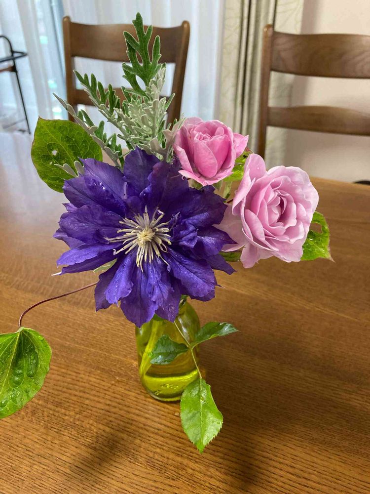 私も今日、花友さんから紫陽花とテッセンの切り花をもらい、ウチの庭でやっと全部咲いたシンビジウムを✂️したのとピンクのゼラニウムもテーブルにいけました。