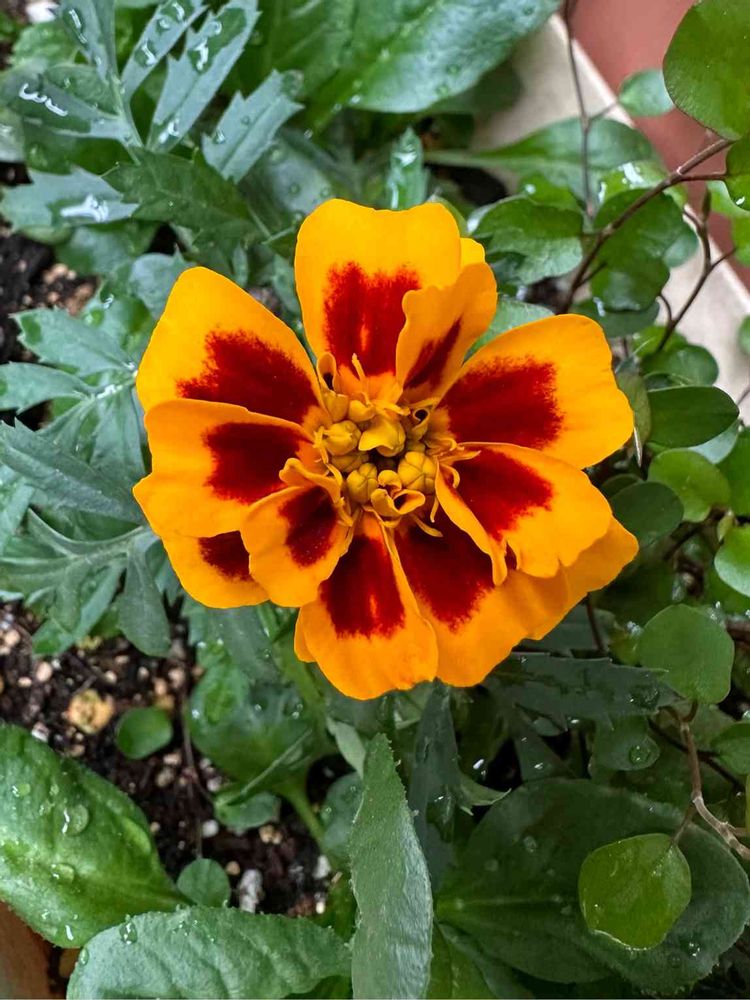 種まきで育てたお花🧡百日草(ジニア)だと思いますが、袋の写真とちょっと違う😳濃い模様が付いていて個性的です🎯