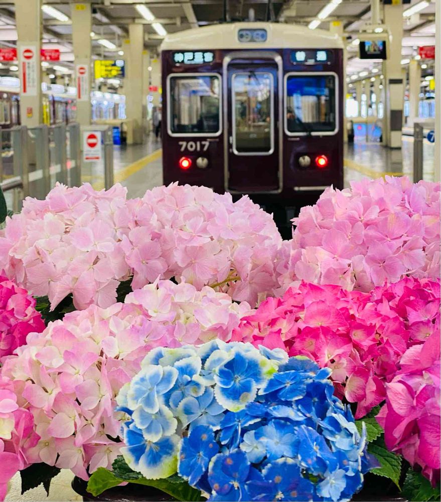 落ち着いたマルーン色の電車には アジサイも似合いますね‼️😀