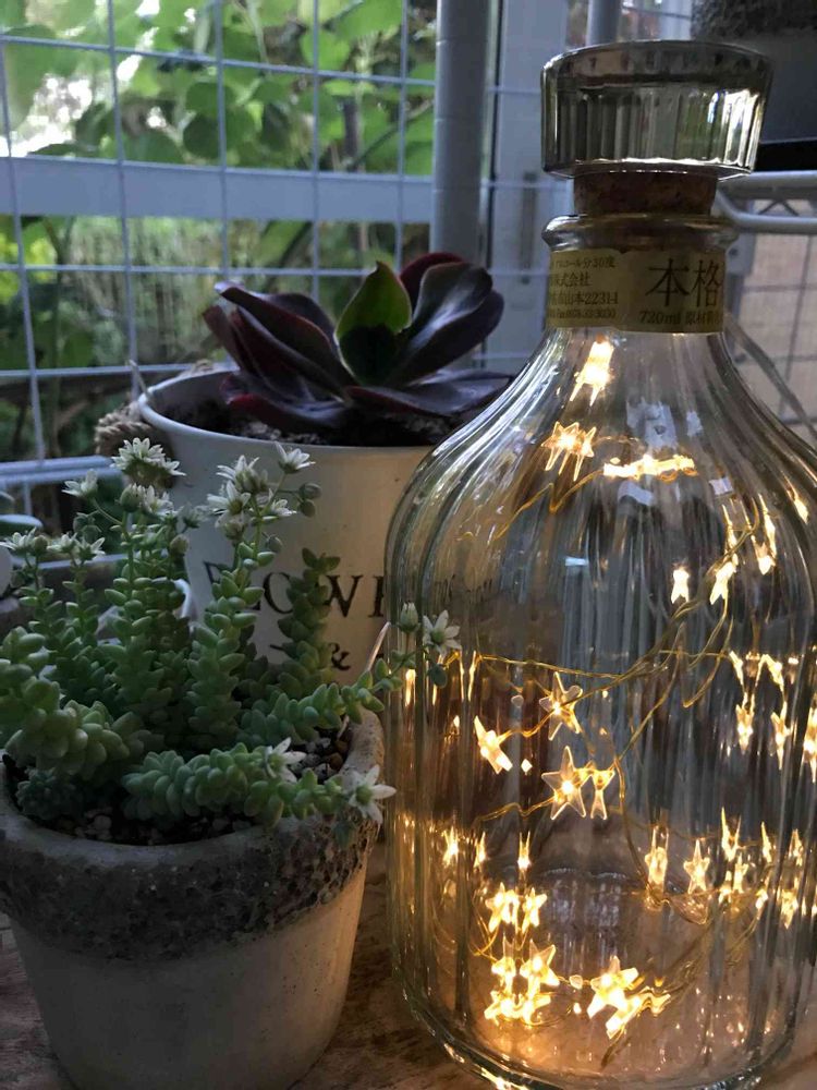本格焼酎いいちこのから瓶に電飾を入れて多肉の側に置きました。うーん、なんかいいぞ!と、ちびちび。しあわせだ。
