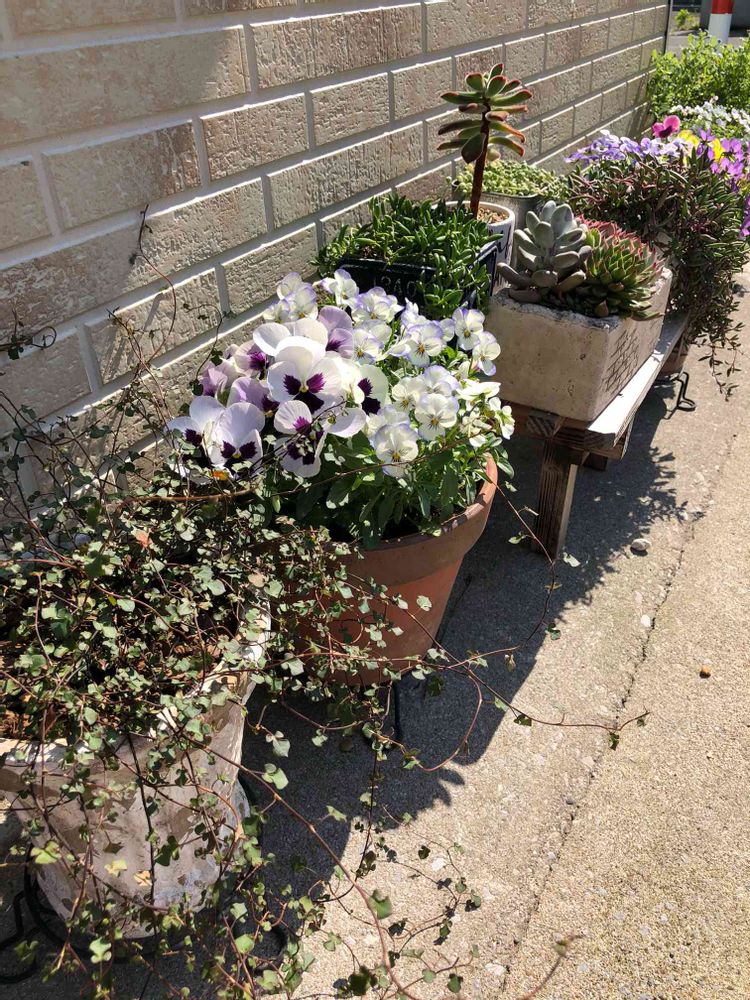 お洒落が並んでますー!白系のパンジーもまとまるとかなり綺麗ですね、手前の子は元気モリモリですね(笑
