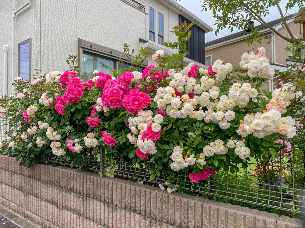 宇部小町が自宅正面のフェンス、ピンクと白バラは正面フェンスの隣です🌹